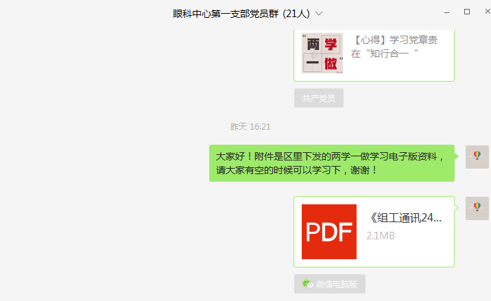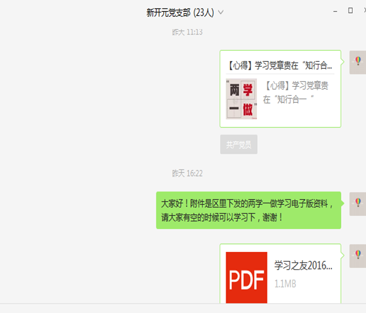 新利体育党风建设之党员微信群、QQ群里的“两学一做”——根据集团的实际情况,每周由党建组织员在党员微信群、QQ群中推送有关“两学一做”的好文章供大家学习、增加大家的理论知识,加深对“两学一做”的理解。