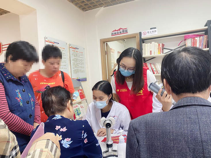 除了入户的老人,还有一部分老人在社区进行眼健康体检。志愿服务队队员现场进行科普宣讲,耐心答疑解惑,百份“光明帖”正在派送中。