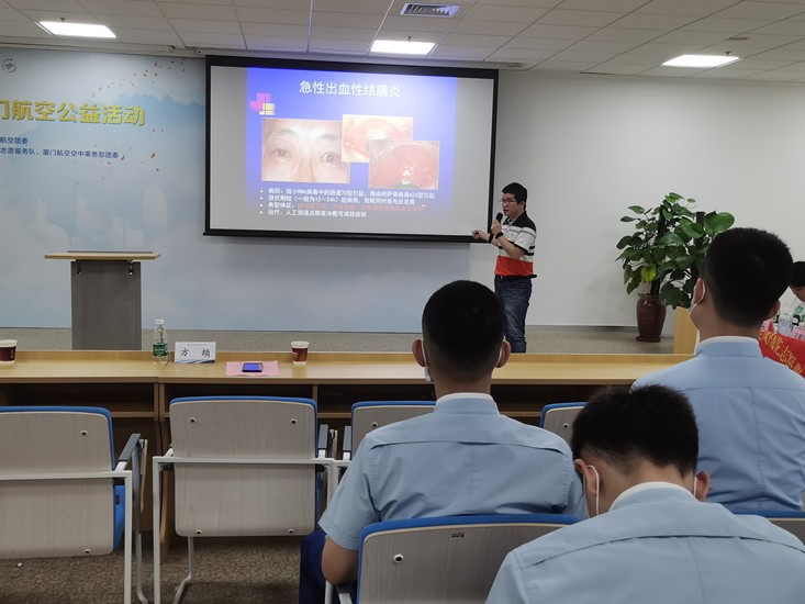 凤凰花“光明先锋”志愿服务队、凤凰花院前急救志愿者服务队两支厦门市卫生健康委员会凤凰花志愿服务品牌队伍,携手走进厦航空中乘务部,为空勤青年提供爱眼护眼讲座、眼健康咨询、检查,传授专业的医疗急救知识等相关志愿服务。