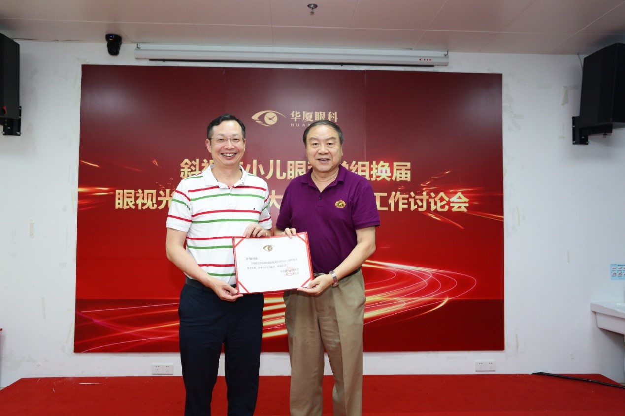 苏庆灿董事长为新当选的第二届斜视与小儿眼科专业委员会主任委员赵堪兴教授、第*一届眼视光专业委员会主任委员潘美华教授颁发了聘书并合影留念。