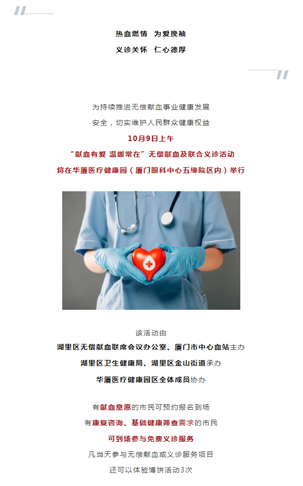 10月9日上午!无偿献血及免费义诊活动将在新利体育医疗健康园举行