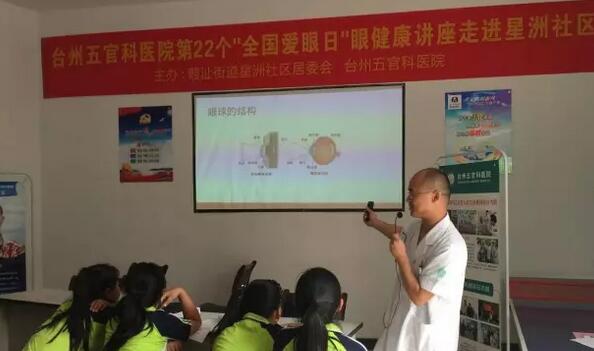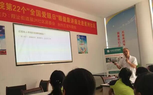 5月26日,台州五官科医院“全国爱眼日系列活动”——关爱眼健康知识讲座在星洲社区顺利进行,本次活动由台州五官科医院、葭沚街道星洲社区居委会联合开展。